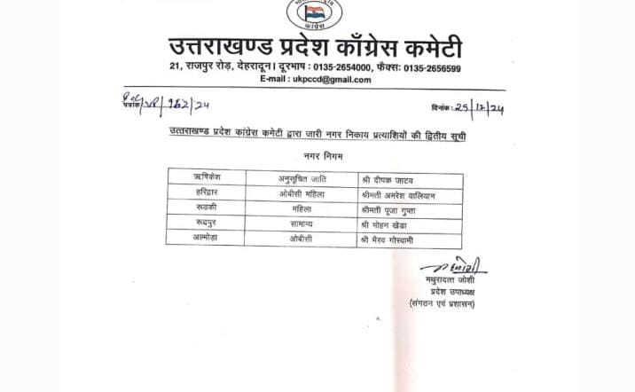 देवभूमि जेके न्यूज ऋषिकेश-कांग्रेस पार्टी की की प्रदेश चुनाव समिति ने होने वाले नगर निकाय चुनाव के लिए निम्नलिखित नामों पर अपनी स्वीकृति प्रदान की है।