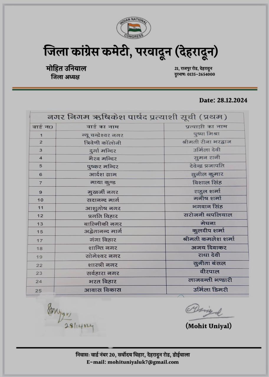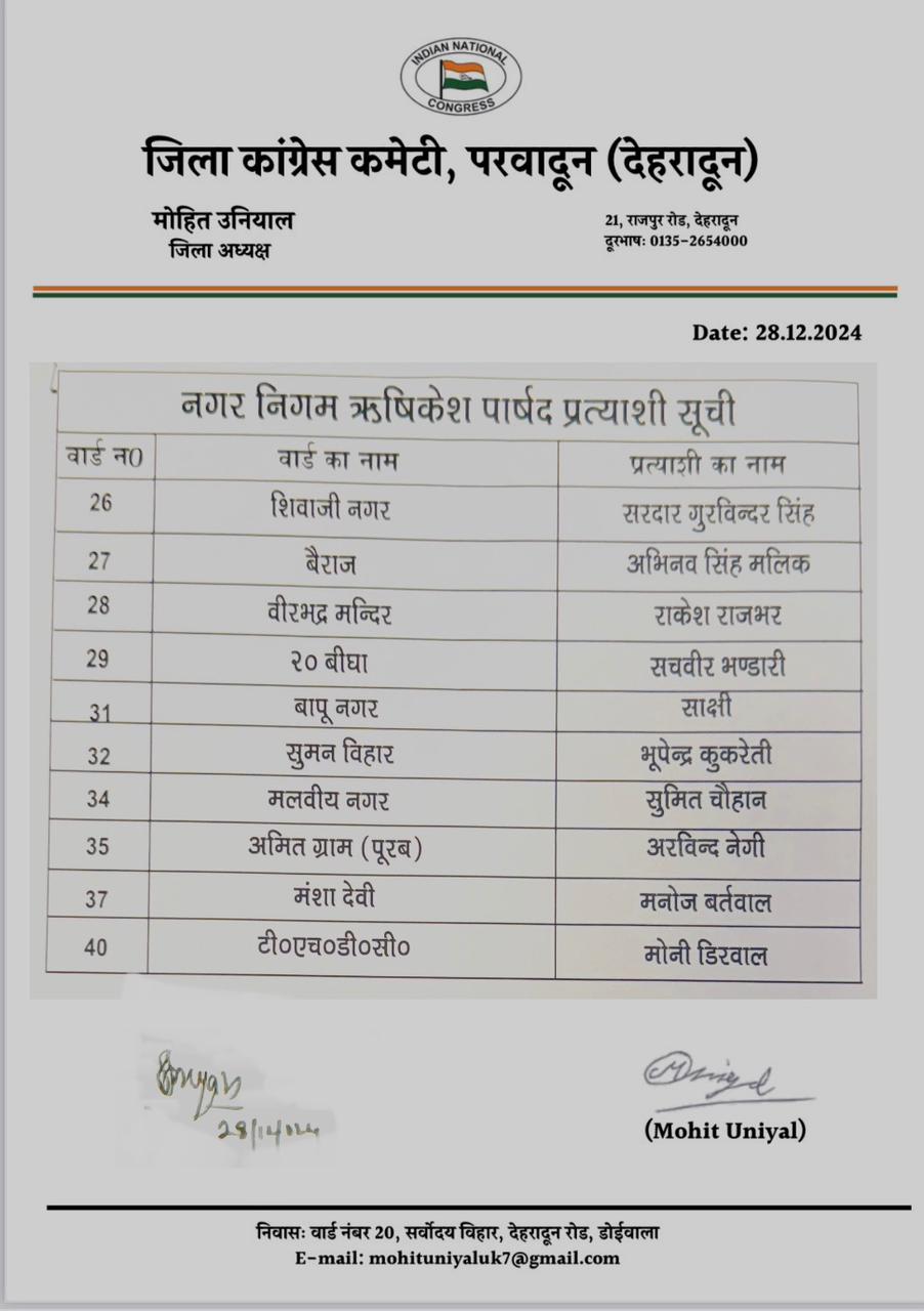 इसके अलावा कांग्रेस पार्टी ने ऋषिकेश के 30 वार्डों की भी सूची जारी की है जो निम्नलिखित है-