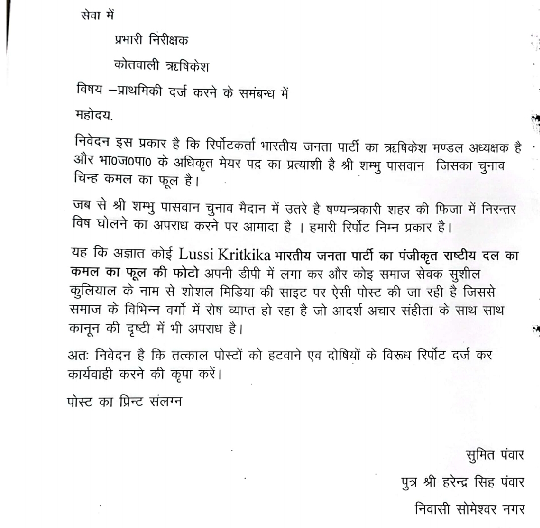 उपरोक्त आशय को संज्ञान में लेते हुए भारतीय जनता पार्टी के नगर अध्यक्ष सुमित पर पंवार द्वारा ऋषिकेश थाने में प्राथमिकी दर्ज कराई गई है। ऋषिकेश प्रभारी निरीक्षक को दिए गए प्रार्थना पत्र में लिखा गया कि-