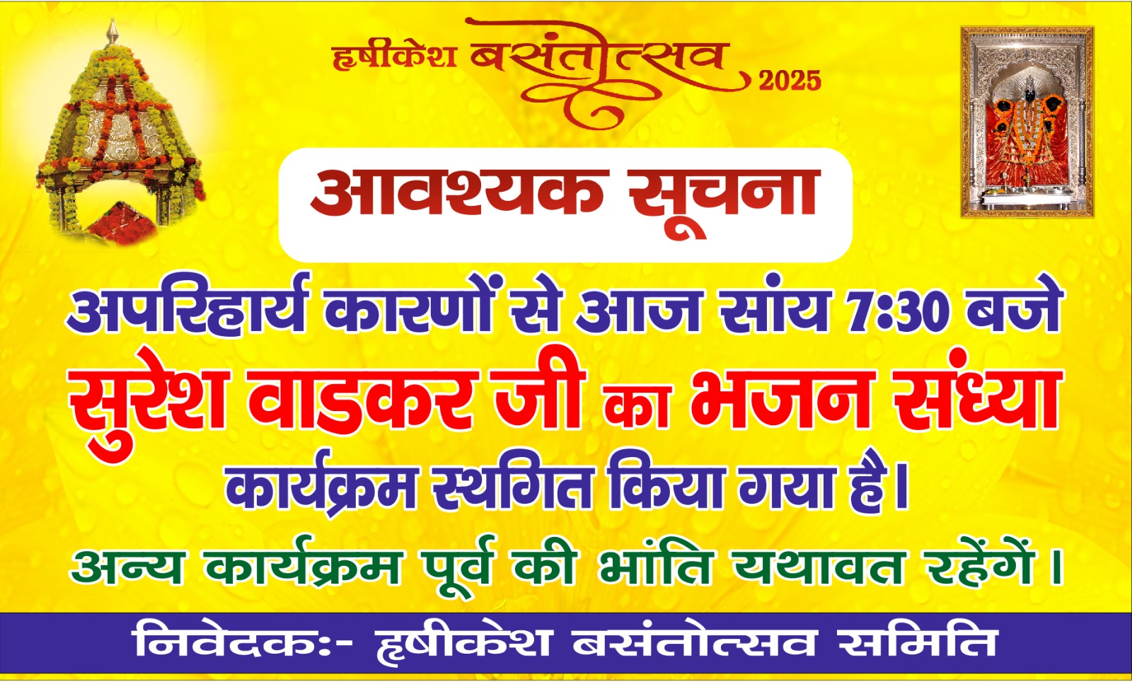 देवभूमि जेके न्यूज ऋषिकेश 1 फरवरी 2025 बसंत उत्सव 2025 में अनेको कार्यक्रम आयोजन किया जा रहे हैं। आज 1 फरवरी को सुप्रसिद्ध गायक सुरेश वाडेकर का कार्यक्रम था लेकिन उनके द्वारा प्राप्त सूचना के अनुसार उनका स्वास्थ्य काफी खराब हो गया, जिसके कारण वह आज के भजन संध्या में प्रतिभाग नहीं करेंगे इसलिए बंसत उत्सव आयोजन समिति ने गायक सुरेश वाडेकर का कार्यक्रम निरस्त कर दिया गया है ।