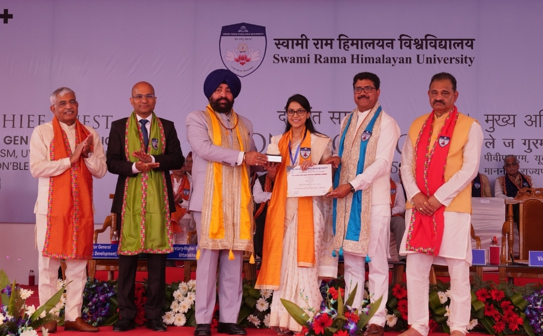 देव भूमि जे के न्यूज -24-MARCH-2025 डोईवाला- स्वामी राम हिमालयन विश्वविद्यालय (एसआरएचयू) जौलीग्रांट के सातवें (सप्तम) दीक्षांत समारोह का आयोजन बेहद भव्य रहा। समारोह के मुख्य अतिथि राज्यपाल लेफ्टिनेंट जनरल गुरमीत सिंह (सेनि.) पीवीएसएम, यूवाईएसएम, एवीएसएम, वीएसएम ने विश्वविद्यालय के 34 मेधावी छात्र-छात्राओं को डिग्री प्रदान की। एमबीबीएस की केजिया, नर्सिंग की खुशी और अंजलि को ‘स्वामी राम बेस्ट ग्रेजुएट अवॉर्ड’ से सम्मानित करने के साथ 19 पीएचडी की उपाधि दी गयी। दीक्षांत समारोह में कुल 997 छात्र-छात्राओं को डिग्री प्रदान की गई।