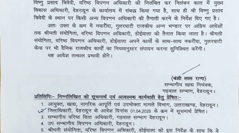 निलंबन मामले के अनुसार जिलाधिकारी देहरादून के कार्यालय आदेशांक 261/आर०ए०-2025, दिनांक 01.04.2025 के माध्यम से गुलरघाटी राजकीय अन्न भण्डार में जिला प्रशासन की टीम द्वारा दिनांक 26/27.03.2025 को किए गए संयुक्त निरीक्षण के दौरान केन्द्र पर पायी गयी अनियमितताओं के संबंध में जिलाधिकारी, देहरादून द्वारा गुलरघाटी राजकीय अन्न भण्डार पर तैनात विष्णु प्रसाद त्रिवेदी, वरिष्ठ विपणन अधिकारी को निलंबित कर निलंबन काल में मुख्य विकास अधिकारी, देहरादून के कार्यालय में संबद्ध किया गया है, साथ ही विष्णु प्रसाद त्रिवेदी के स्थान पर किसी अन्य विपणन अधिकारी की तैनाती करने के निर्देश दिए गए है। उक्त के क्रम में नकरौंदा, गुलरघाटी राजकीय अन्न भण्डार पर अग्रिम आदेशों तक श्रीमती संयोगिता, वरिष्ठ विपणन अधिकारी, डोईवाला को तैनात किया जाता है। श्रीमती संयोगिता, वरिष्ठ विपणन अधिकारी, डोईवाला अपने कार्यों के साथ-साथ नकरौंदा, गुलरघाटी केन्द्र पर भी दैनिक राजकीय कार्यों का नियमानुसार संपादन करना सुनिश्चित करेंगी।