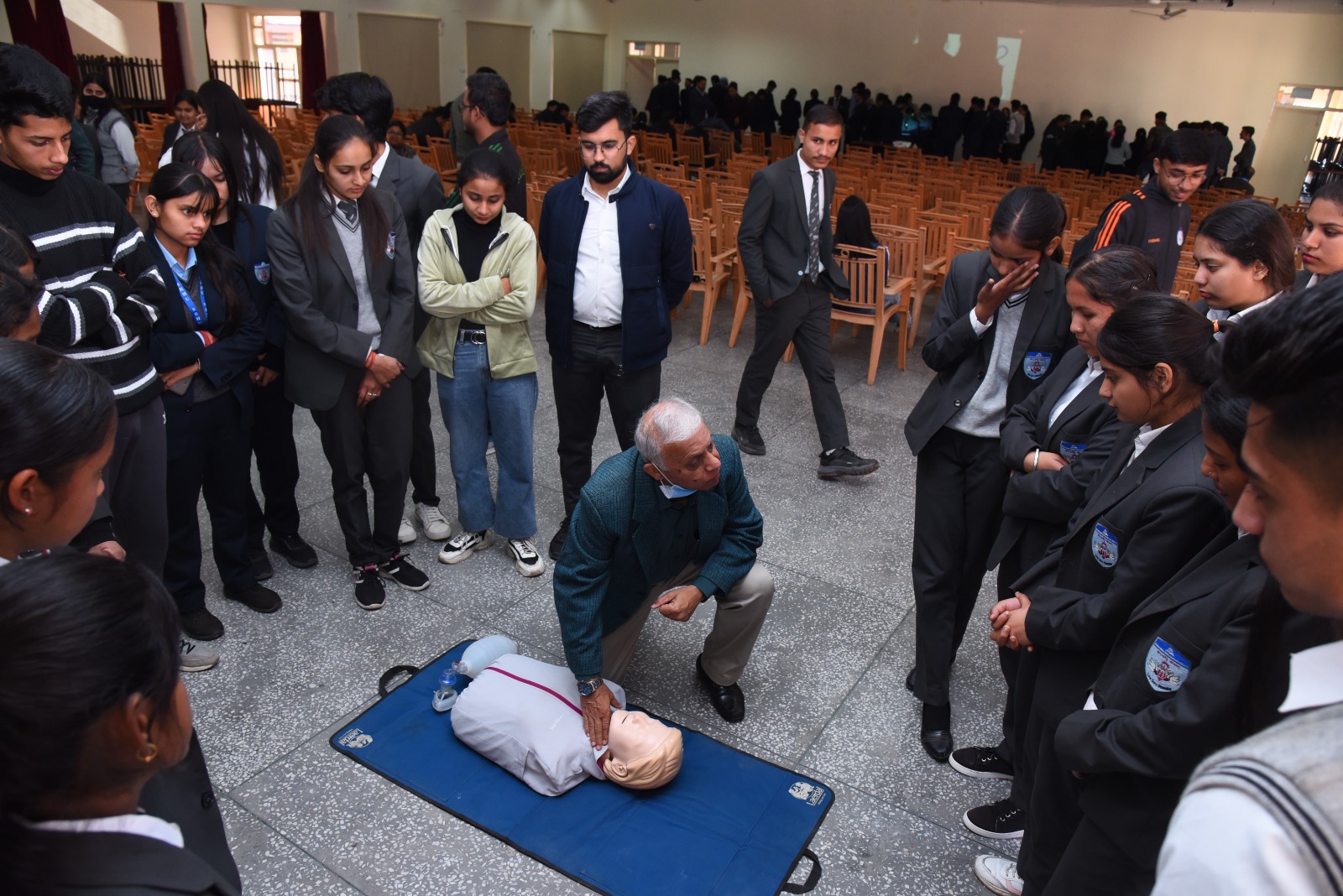 डॉ.गुरजीत खुराना, डॉ.सुशांत खंडूरी, डॉ.सोनिका, डॉ.नितिका अग्रवाल, डॉ.प्रिया व कार्यशाला समन्वयक डॉ.राजेश शर्मा ने छात्र-छात्राओं को पुतलों पर सीपीआर देने का अभ्यास करवाया।