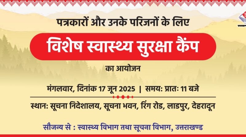 मुख्यमंत्री पुष्कर सिंह धामी के निर्देश के क्रम में मंगलवार 17 जून को स्वास्थ्य और सूचना विभाग की ओर से पत्रकारों और उनके परिजनों की नि:शुल्क स्वास्थ्य जांच के लिए, विशेष स्वास्थ्य सुरक्षा कैम्प का आयोजन किया जा रहा है। इसमें राजकीय दून मेडिकल कॉलेज के वरिष्ठ चिकित्सकों द्वारा जांच के साथ ही परामर्श भी प्रदान किया जाएगा।