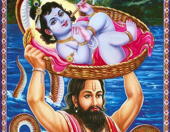वासुदेव जी ने एक टोकरी लेकर जिसमें कि उनका खाना आता था,इसमें कपड़े बिछाकर कृष्ण जी को लिटाया और टोकरी को सिर पर रखकर कारागार से निकल पड़े। कारागार से बिल्कुल सीधा रास्ता यमुना जी को जाता है। यमुना जी कारागार से लगभग दो कोस दूरी पर है।ज्यों ज्यों वासुदेव आगे बढ़ते जाते थे , बारिश और तेज होती जा रही थी। कमर तक पानी में चलकर वासुदेव यमुना जी पहुंच गए पर यह क्या यमुना जी अपने पूरे उफान पर थी। बारिश और तेज होने लगी यहां तक कि पानी वासुदेव जी के गले तक आ गया पर यमुनाजी थी कि थमने का नाम ही नहीं ले रही थी। तभी शेषनाग ने अपना फन फैलाकर भगवान कृष्ण के ऊपर छतरी बना दी। भगवान कृष्ण के पंजे टोकरी से थोड़ा बाहर निकले हुए थे। यमुना जी बढ़ते बढ़ते भगवान कृष्ण के पैरों अंगूठे को स्पर्श करने आई। भगवान कृष्ण के चरणों का स्पर्श कर यमुना जी धन्य हो गई और उन्होंने अपनी तीव्रता कम कर दी।