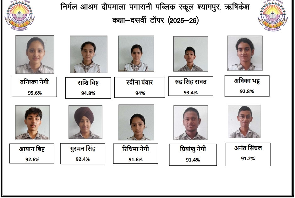 कक्षा 10वीं के परिणाम अत्यंत सराहनीय रहे। आराध्य थपलियाल ने 97.6% अंकों के साथ प्रथम स्थान प्राप्त किया, जबकि नैतिक डबराल ने 97.4% अंकों के साथ द्वितीय स्थान हासिल किया। पीयूष झा ने 94.6% अंकों के साथ तृतीय स्थान प्राप्त किया। परीति पुलामी ने 94% अंकों के साथ चतुर्थ तथा कृषणा ने 93.2% अंकों के साथ पंचम स्थान प्राप्त किया।