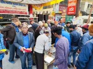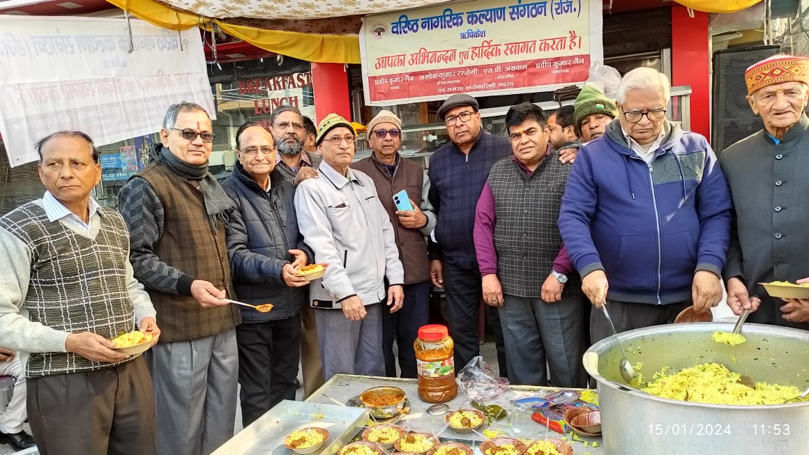 मकर संक्रांति पर्व के अवसर पर नगर की प्रतिष्ठित संस्था वरिष्ठ नागरिक कल्याण संगठन ने हरीद्वार रोड पर श्री दिगम्बर जैन मन्दिर के बाहर खिचड़ी महाप्रसाद वितरण कर इस पर्व को बड़ी धूमधाम से मनाया। भारी संख्या में नगर के वरिष्ठ नागरिक जनों ने स्वयं प्रसाद वितरण कर पुण्य लाभ कमाया।सनातन धर्म संस्कृति में इस पर्व की बहुत महत्ता है। सभी सदस्य जनों ने बड़ी श्रद्धा के साथ राह से गुजरने वाले लोगों को खिचड़ी एवम तिल के लडडू वितरित किए। संगठान के अध्यक्ष प्रमोद कुमार जैन ने बताया कि संगठन द्वारा यह पुनीत कार्य प्रतिवर्ष किया जाता है। संगठन सभी वरिष्ठों एवम जरूरतमंदों की सेवा करने के लिए सदैव तत्पर है।