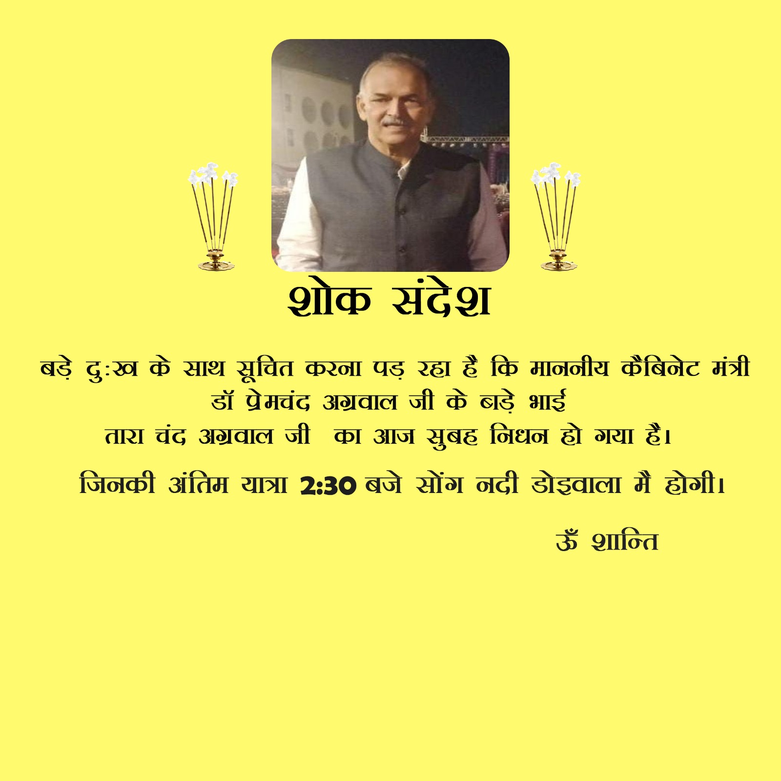 बड़े दुख के साथ सूचित करना पड़ रहा हे की वित्त मंत्री उत्तराखण्ड सरकार प्रेमचंद अग्रवाल जी के बड़े भाई तारा चंद अग्रवाल का आज सुबह बीमारी के कारण निधन हो गया है ! अंतिम संस्कार आज 02/02/2024- अपरान्ह 2.30 बजे सोंग नदी के किनारे, डोईवाला मैं किया जायेगा.