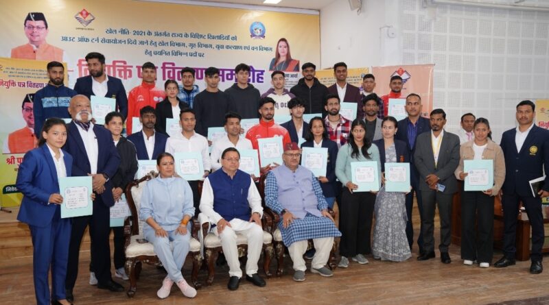 मुख्यमंत्री पुष्कर सिंह धामी ने सोमवार को मुख्य सेवक सदन में खेल नीति-2021 के अंतर्गत विभिन्न पदों पर चयनित राज्य के 31 विशिष्ट खिलाड़ियों को खेल विभाग, गृह विभाग, युवा कल्याण एवं वन विभाग में आउट ऑफ टर्न सेवायोजन, परिवहन विभाग में 25 कनिष्ठ सहायकों तथा उद्यान विभाग में 28 सहायक लेखाकारों को नियुक्ति पत्र प्रदान किये। इस प्रकार कुल 84 अभ्यर्थियों को मुख्यमंत्री ने नियक्ति पत्र वितरित किये।