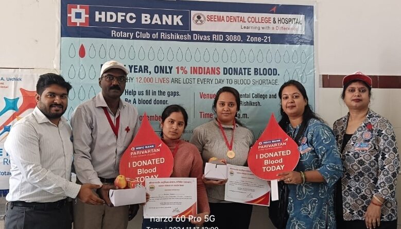 रोटरी क्लब ऋषिकेश दिवास ने एच डी एफ सी बैंक के सहयोग से सीमा डेंटल कॉलेज में लगाया ब्लड डोनेशन कैंप।