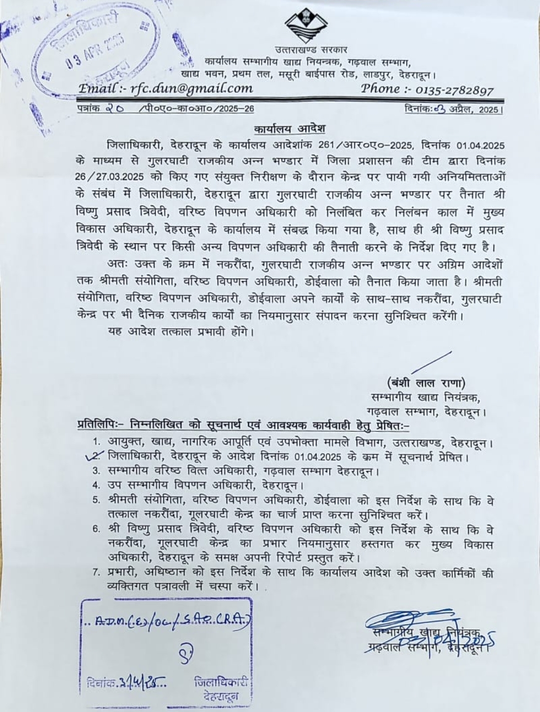 *ब्रेकिंग -अनियमितताओं के चलते विष्णु प्रसाद त्रिवेदी वरिष्ठ विपणन अधिकारी को किया निलंबित 3 April 20253 April 2025देवभूमि jknews Comment देव भूमि जे के न्यूज,दिनांकः 3 अप्रैल, 2025 देहरादून- विगत दिनों गूलरघाटी राजकीय अन्न भंडार में जिला प्रशासन द्वारा निरीक्षण किया गया जिसमें [...]